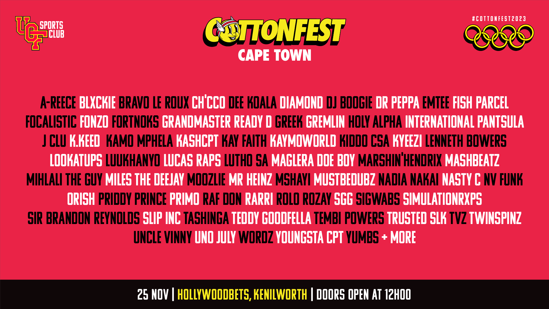 COTTON FEST LINEUP CONFIRMED FOR ITS HIGHLY ANTICIPATED RETURN TO THE MOTHER CITY Cotton Fest, the annual entertainment and lifestyle festival, is ready to set the Mother City alight with a vibrant spectrum of sound and fashion at the Hollywoodbets Kenilworth Racecourse on Saturday, 25th November 2023. Building up to the festival, Cape Town will once again be the epicenter of a celebration