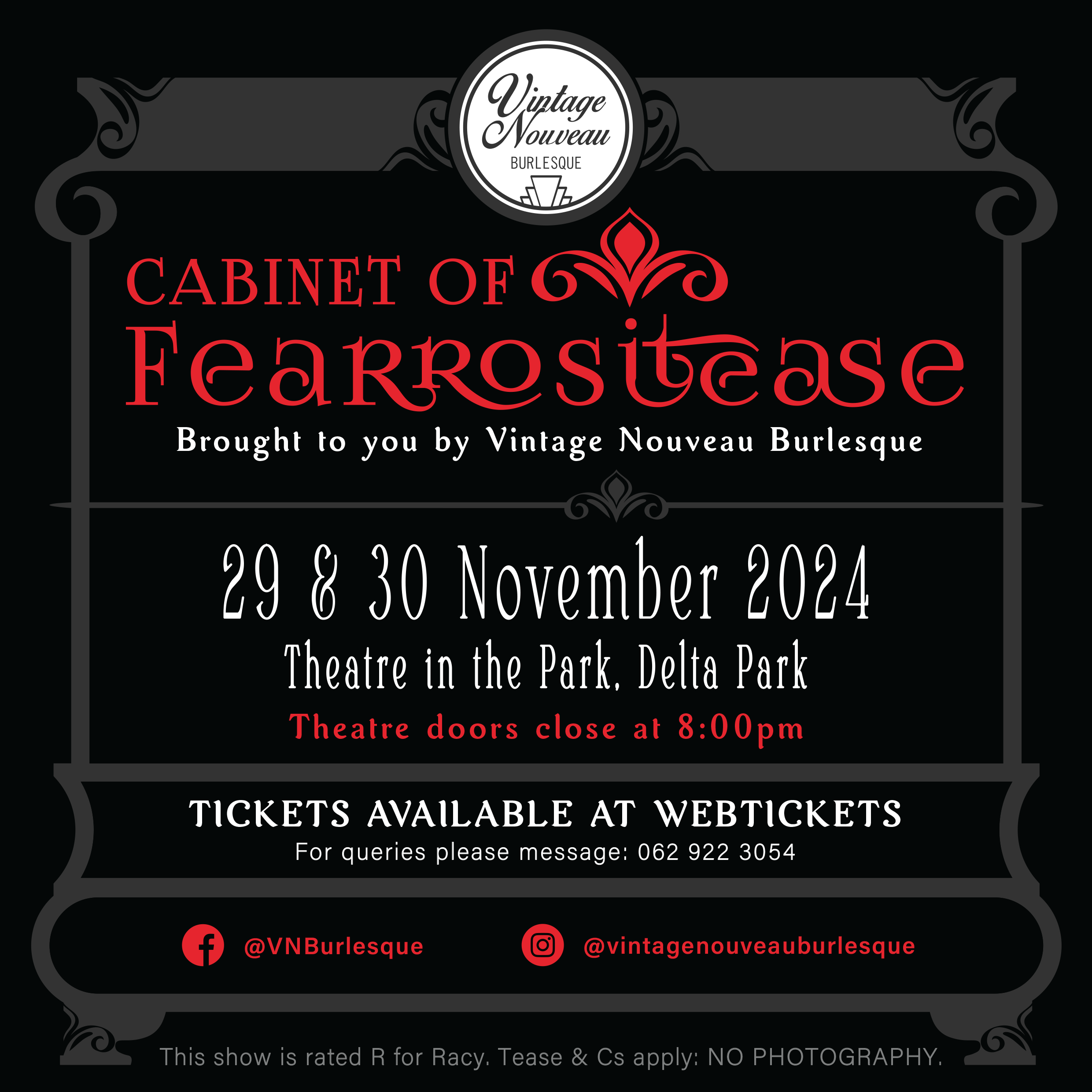 29 & 30 NOVEMBER THEATRE IN THE PARK, DELTA PARK Step into the dazzling world of burlesque like never before! Vintage Nouveau Burlesque invites you to experience their first post-COVID production, CABINET OF FEARROSITEASE, an exhilarating, high-energy show that will awaken your senses and challenge your perceptions. The show is set to run for two unforgettable nights, on the 29th and 30th