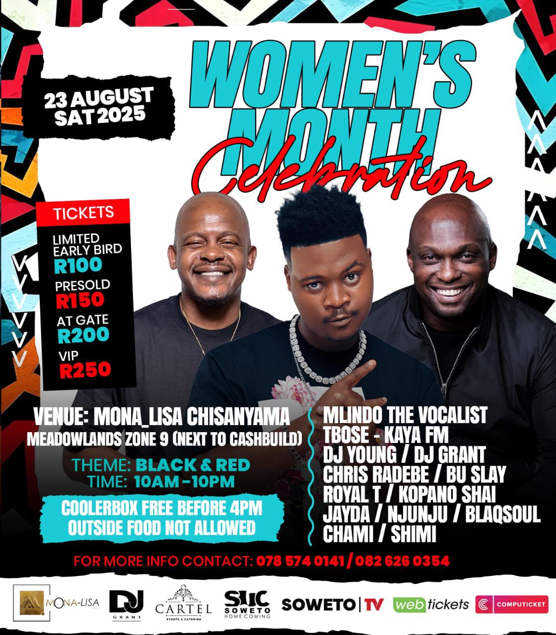 Soweto Women's Month Celebration Join us in Soweto as we celebrate women in our annual Women’s Month Celebration. The beautiful event will take place on the 23rd August 2025 from 10:00 till 20:00. THEME CODE: All Shades of Pink, White and Denim Limited tickets are available at Shoprite, Checkers, Checkers Hyper, Pick n Pay, Online Computicket or Online at Webticket: Computicket Online Link: Webticket Online Link: Early