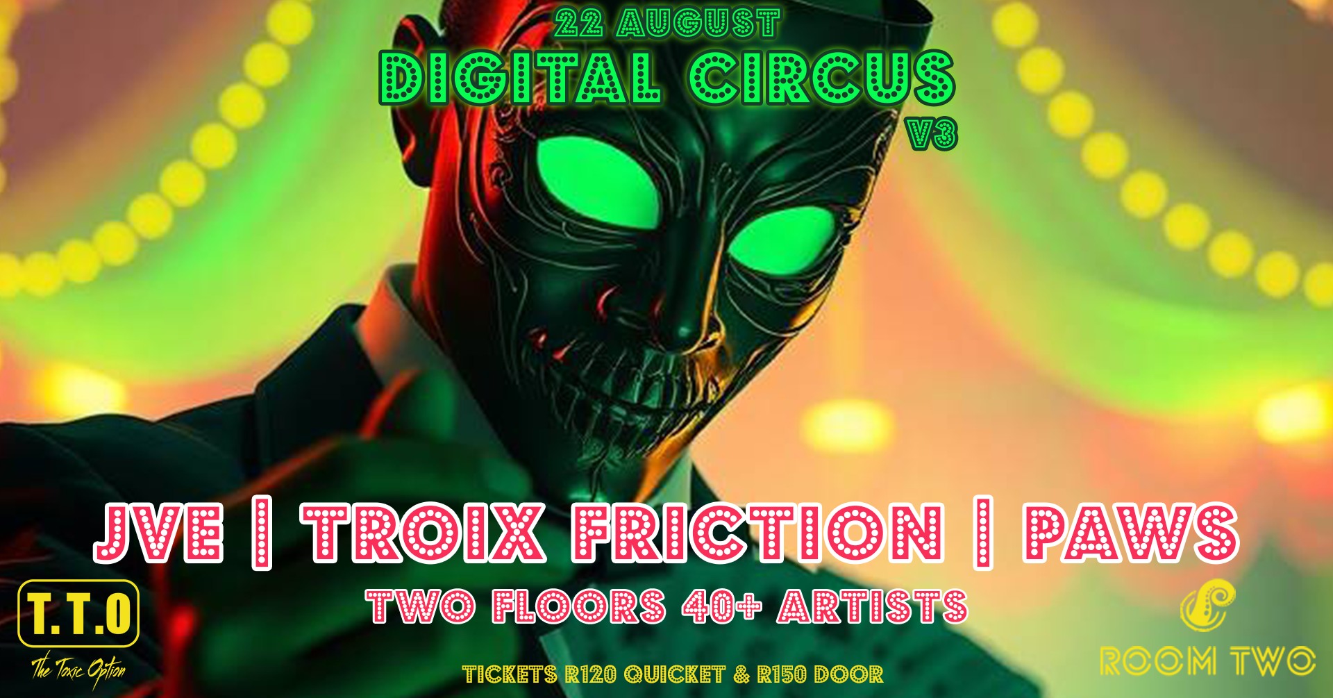 T. T. O DIGITAL CIRCUS v3 presents JVE | TROIX FRICTION | PAWS Get ready for the DIGITAL CIRCUS v3 takeover - Two stages, over 40+ artists. We're taking over Sognage, bringing you two incredible techno stages to choose from. On the main stage, JVE | TROIX FRICTION | PAWS will headline, backed by your favourite TTO regulars. Room Two will be brimming