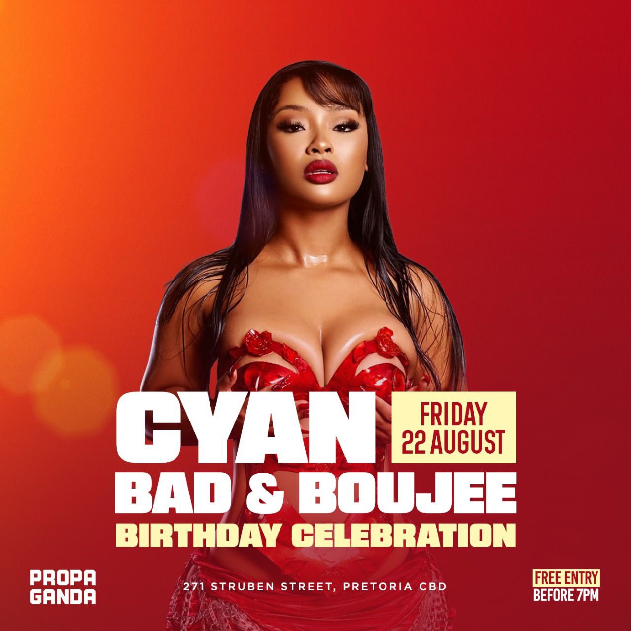 CYAN BAD & BOUJEE BIRTHDAY CELEBRATION 🗓️: FRI 22 Aug 2025 🎫: Free entry before 7pm 📍: Propaganda ⏰: Doors open at 11:00 till late 🅿️: Secured Parking 🏅: Superb Hospitality 🏢: 3 FLOORS OF FUN AND ENTERTAINMENT #cyanboujee#Restaurant #Freshfood #Africancuisene #BestClub #Hostess #BottleService #drinks #drinkspecials #drinkresponsibly #Hubbly #entertainment #goodmusic #amapiano #housemusic #afrohouse #Hiphop #djset #nightlife #Pool #Tshwane #Pitori #CBD #Pretoriaevents