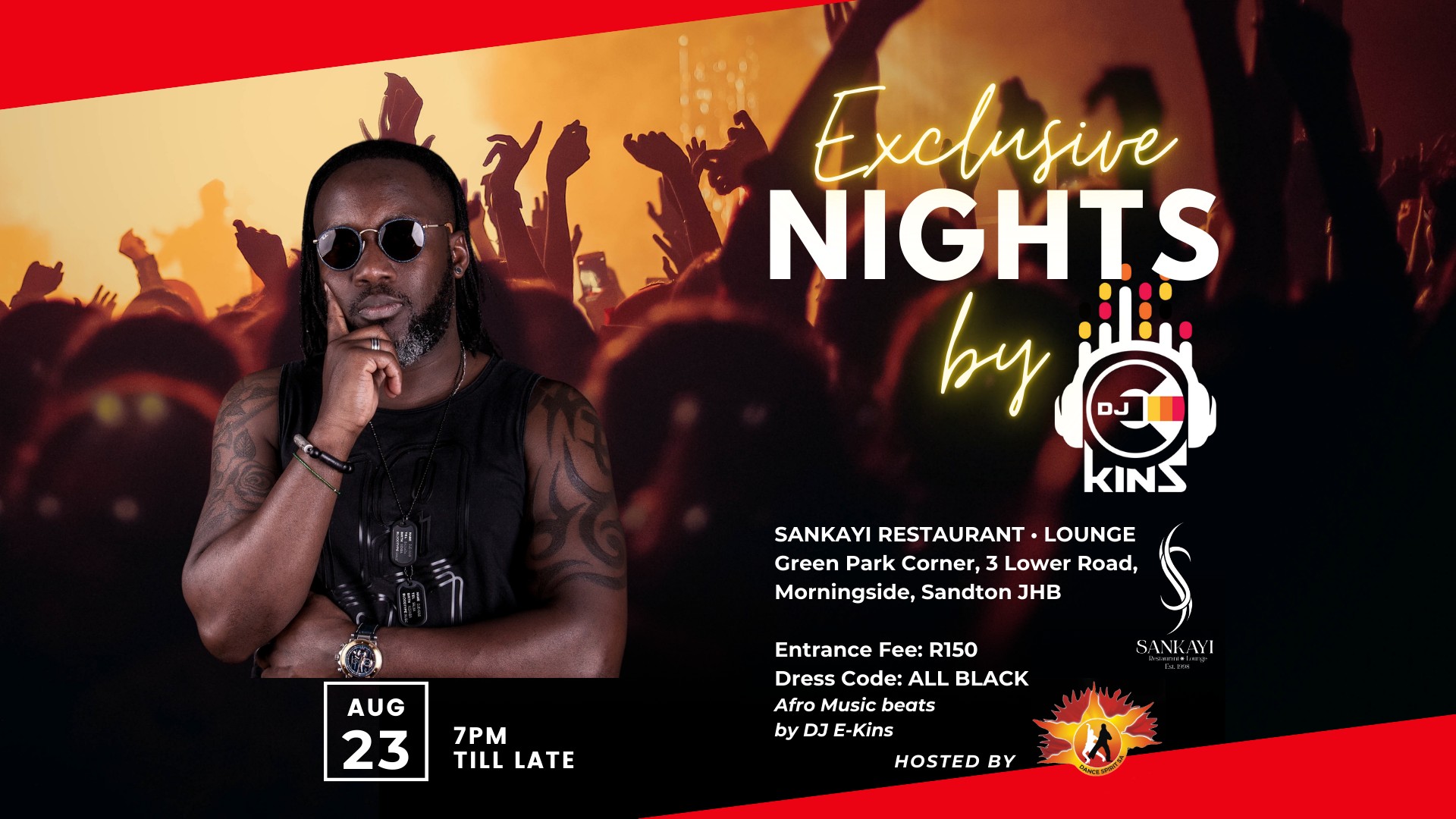 🎉 EXCLUSIVE NIGHTS by DJ E-KINS 🎉 The vibes return this Saturday, 23rd August, as DJ E-KINS takes over Sankayi Restaurant, Sandton for another unforgettable edition of Exclusive Nights! 🕖 From 7PM till late 📍 Sankayi Restaurant & Lounge, 3 Lower Road, Morningside, Sandton 🎶 Afro Vibes Only – Kizomba | Semba | Rumba | Zouk | Amapiano | Afrobeats 👗 Dress Code: ALL BLACK
