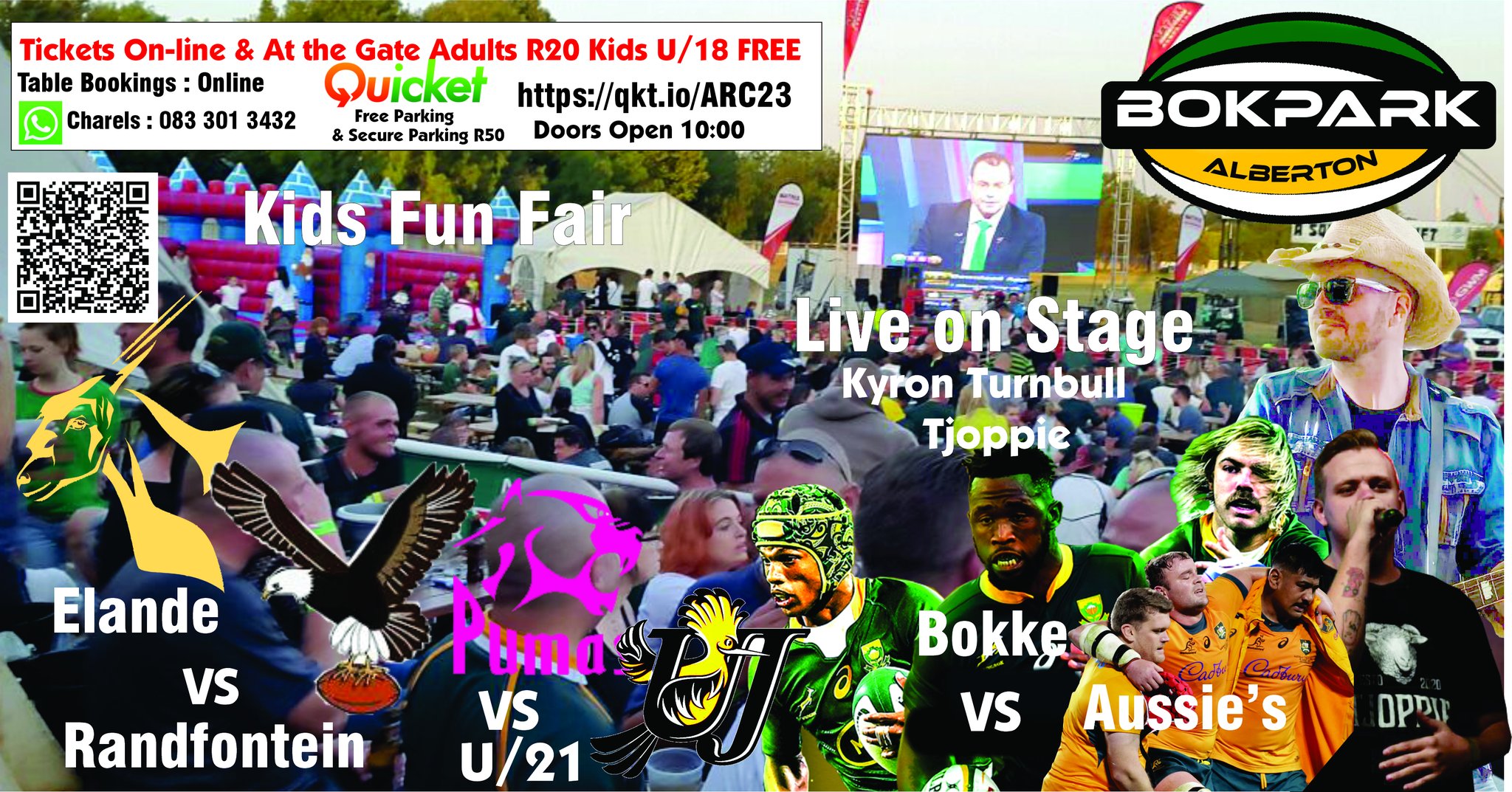 Alberton Bokpark open on 23 August with Great Rugby staring with the Elande vs Randfontein, Pumas vs UJ and the Springboks. Live performance on Stage before and After the Games Beer garden and a Kids Funfair. Tickets are available on-line and at the Gates. Adults R20 and Kids U/18 for Free. Table Reservation also available -Online. Once Booked on - Line WhatsApp Charles