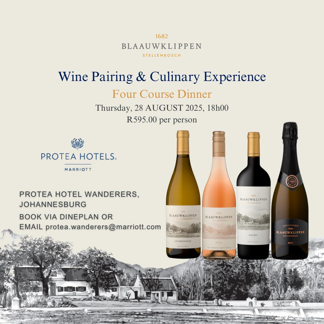 Four Wines, Four Course Dinner and Great Company await you at the Protea Hotel by Marriott Johannesburg Wanderers, in partnership with Blaauwklippen Vineyards.